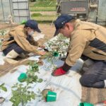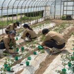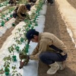 本日、暑い中でしたが、3年生農業経営科野菜コースの授業でハウス内にミニトマトの定植を行いました。第一花房がわかるものは畝の谷の方に向け、今後の管理をしやすくするために丁寧に行いました。また、大玉トマトも3年生農業経営科野菜コースが管理しています。おいしいトマトができるよう全力で取り組んで行きます。