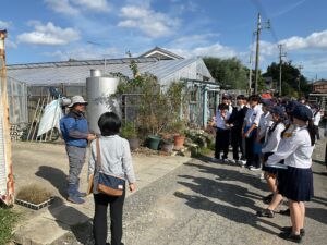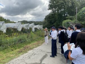 午前中は加西市岸呂町にある加西ぶどう農園で見学を行いました。仕事を引退後、長野県でブルーベリーを栽培され、地元の兵庫県に戻り加西市でブドウ栽培を始めました。仕事をされていた頃からの人生を振り返り、農業の楽しさやブドウ栽培のおもしろさなどをたくさん教えていただきました。