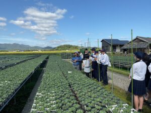 午後には市内の花農家である小谷園芸と高見園芸に向かいました。ハボタンの栽培についてや多肉植物の栽培についての苦労や栽培される思いなども伺うことができました。高見園芸では育種についても触れることができました。