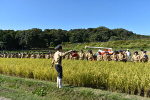 10月9日(木)に3年生農業経営科作物機械コースの先輩方に収穫の仕方について教えていただきながら、1年生全員で有機栽培の水田で栽培している「ヒノヒカリ」の収穫を行いました。6月17日に全員で裸足になって田植えを行い、暑い夏でもすくすくと育ちこの日を迎えることができました。有機栽培を行っている圃場のため、様々な生物も多く命の大切さを感じながら稲刈りを行いました。