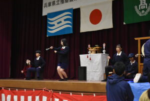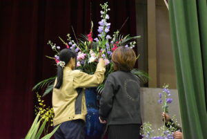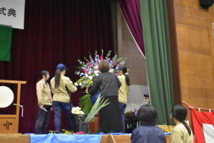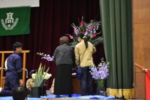 10/31(金)放課後、記念式典に向け、壇上の花の準備と郷土伝統文化継承クラブ(歌舞伎部)のリハーサルが行われました。壇上花は3年生園芸科の生徒たちが、先生の指導を受けながら、大きな花瓶に活けていきました。式にふさわしい華やかな仕上がりとなりました。歌舞伎のリハーサルは制服姿のままでしたが、緊張の面持ちで動きなどを念入りに確認し、本番に向け最後の調整を行っていました。当日は華やかな衣装を身にまとい、式典のオープニングを飾ります。会場設営は1年生を中心に行いました。