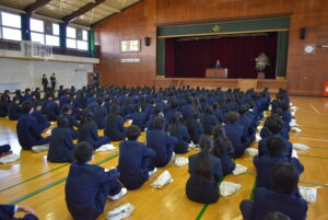 校長先生の式辞では、今年度のテーマ「未来志向 ~Plant the Seeds of Tomorrow~」について、お話がありました。生徒は真剣に話を聞いていました。