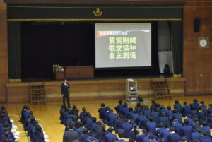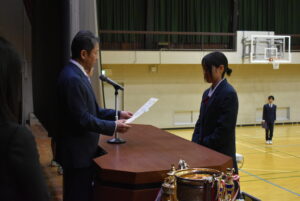 3/23(月)3学期終業式を行いました。校長講話では「Respect Ourselves」について改めて、自分自身を大切にすること、周囲の人を大切にすること、農業を学ぶことに誇りを持つことを話されました。1年間の振り返りと次への目標についても生徒たち同士で話す時間を設け、思いを自分たちの言葉で発し確認しあっていました。校歌斉唱ののち、表彰伝達があり、先日開催された第44回兵庫県ブラックアンドホワイトショウの結果が表彰されました。生徒指導部長からは春休みの過ごし方と4月から導入される交通違反の反則金制度(青切符)についての話がありました。
