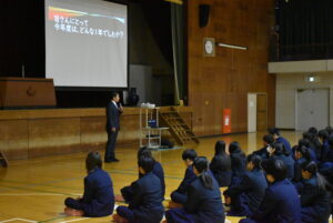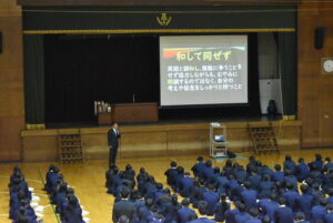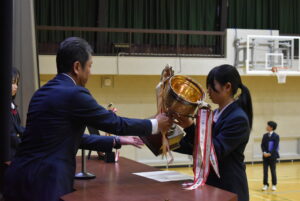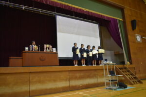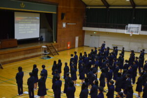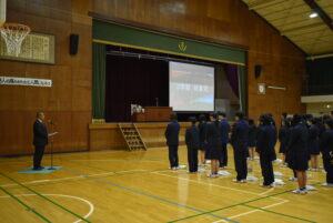 3/23(月)3学期終業式を行いました。校長講話では「Respect Ourselves」について改めて、自分自身を大切にすること、周囲の人を大切にすること、農業を学ぶことに誇りを持つことを話されました。1年間の振り返りと次への目標についても生徒たち同士で話す時間を設け、思いを自分たちの言葉で発し確認しあっていました。校歌斉唱ののち、表彰伝達があり、先日開催された第44回兵庫県ブラックアンドホワイトショウの結果が表彰されました。生徒指導部長からは春休みの過ごし方と4月から導入される交通違反の反則金制度(青切符)についての話がありました。