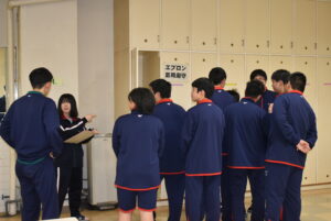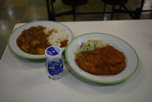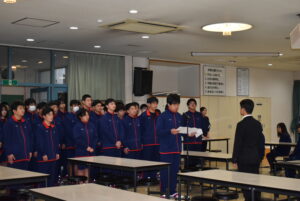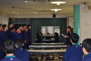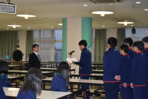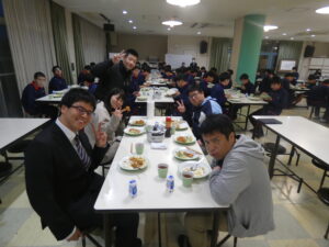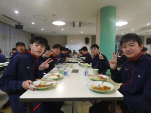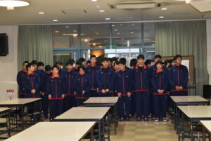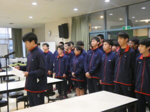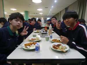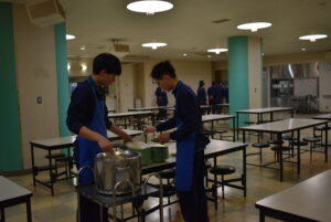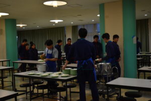 入寮式のあと、1年生は舎内着に着替え、寮の対面式に臨みました。入寮生代表あいさつ、寮役員紹介、と粛々と式は進み、式のあとは初めての寮での食事になります。この日の夕食はカツカレー。給仕を先輩たちが行い、笑顔で完食していました。