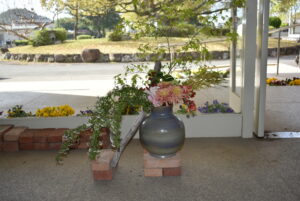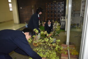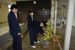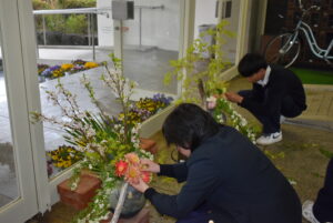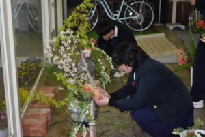 放課後、玄関で花いけバトルの練習を園芸科のHFDコースの生徒がしていました。同じ花材、同じ花瓶を用いてもそれぞれの個性が出るのがおもしろく、それぞれがお互いにチェックしながら作品を完成させました。